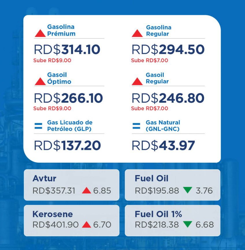 El Ministerio de Industria, Comercio y Mypimes (MICM) informó el aumento de las gasolinas premium y regular, en RD$ 9.00 y RD$ 7.00 pesos, así como reajuste del gasoil regular y óptimo.